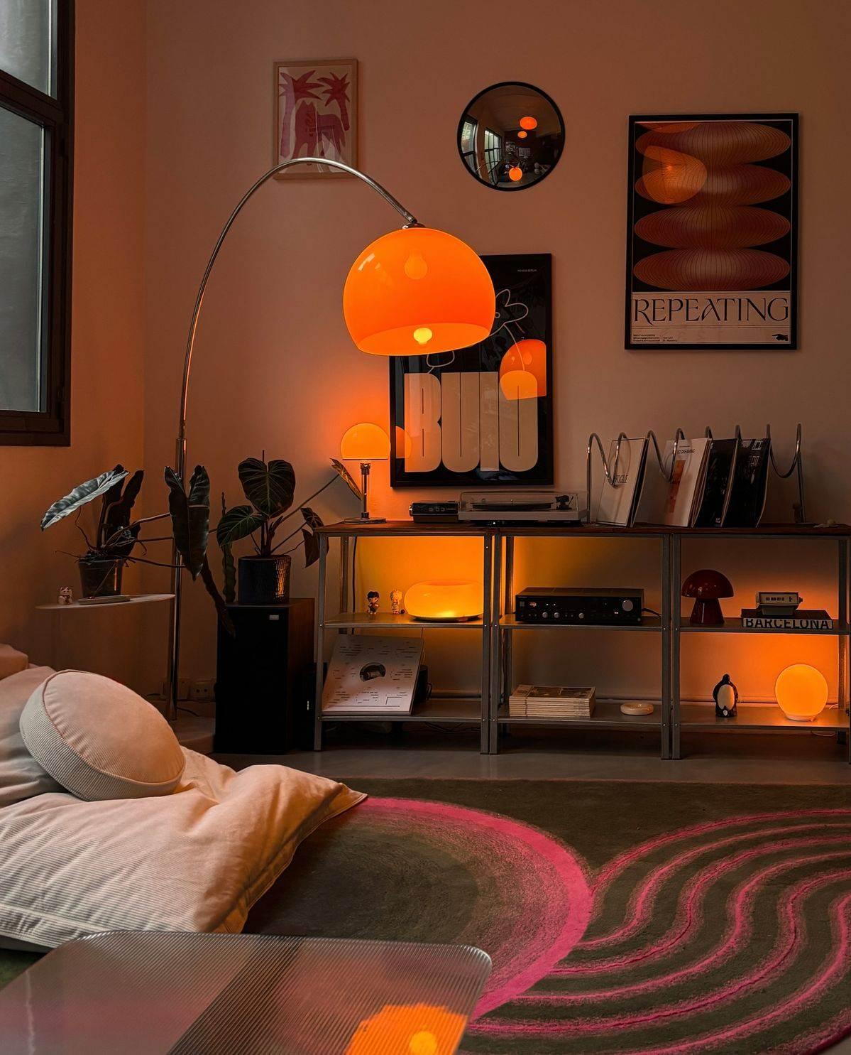 Pirinç detaylı vintage model bir lambader ya da turuncu, sarı ve kırmızı gibi renklerin çarpıcı etkisiyle öne çıkan lambader modelleri ile evinizde retro havası estirebilirsiniz.