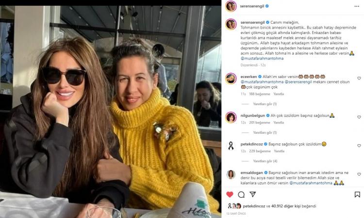 Tohmamın biricik annesini kaybettik.. Bu sabah hatay depreminde evleri çökmüş göçük altında kalmışlardı. Enkazdan babası kurtarıldı ama maalesef melek annesi dayanamadı tarifsiz üzgünüm.. Allah başta hayat arkadaşım tohmamın ailesine ve depremde yakınlarını kaybeden herkese Allah rahmet eylesin acım sonsuz.. Allah tohma'm a ailesine ve herkese sabır versin" diyerek üzüntüsünü dile getirdi.