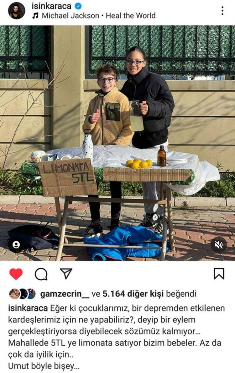 Ünlü şarkıcı depremzedeler için limonata satan Mia ve Jazz'ın karelerine "Eğer ki çocuklarımız 'Depremden etkilenen kardeşlerimiz için ne yapabiliriz?' deyip, bir eylem gerçekleştiriyorsa diyebilecek sözümüz kalmıyor. Mahallede 5 TL'ye limonata satıyor bizim bebeler. Az da çok da iyilik için. Umut böyle bir şey" şeklinde not düştü.