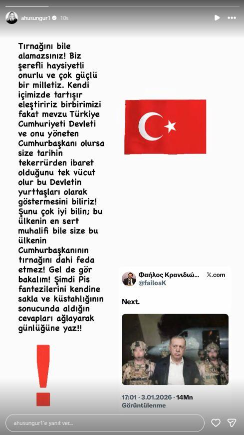 "Tırnağını bile alamazsınız! Biz şerefli haysiyetli onurlu ve çok güçlü bir milletiz. Kendi içimizde tartışır eleştiririz birbirimizi fakat mevzu Türkiye Cumhuriyeti Devleti ve onu yöneten Cumhurbaşkanı olursa size tarihin tekerrürden ibaret olduğunu tek vücut olur bu Devletin yurttaşları olarak göstermesini biliriz!