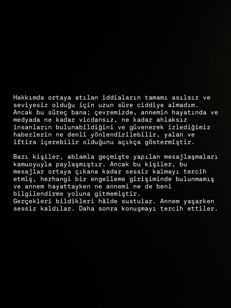 "Hakkımda ortaya atılan iddiaların tamamı asılsız ve seviyesiz olduğu için uzun süre ciddiye almadım. Ancak bu süreç bana; çevremizde, annemin hayatında ve medyada ne kadar vicdansız, ne kadar ahlaksız insanların bulunabildiğini ve güvenerek izlediğimiz haberlerin ne denli yönlendirilebilir, yalan ve iftira içerebilir olduğunu açıkça göstermiştir."