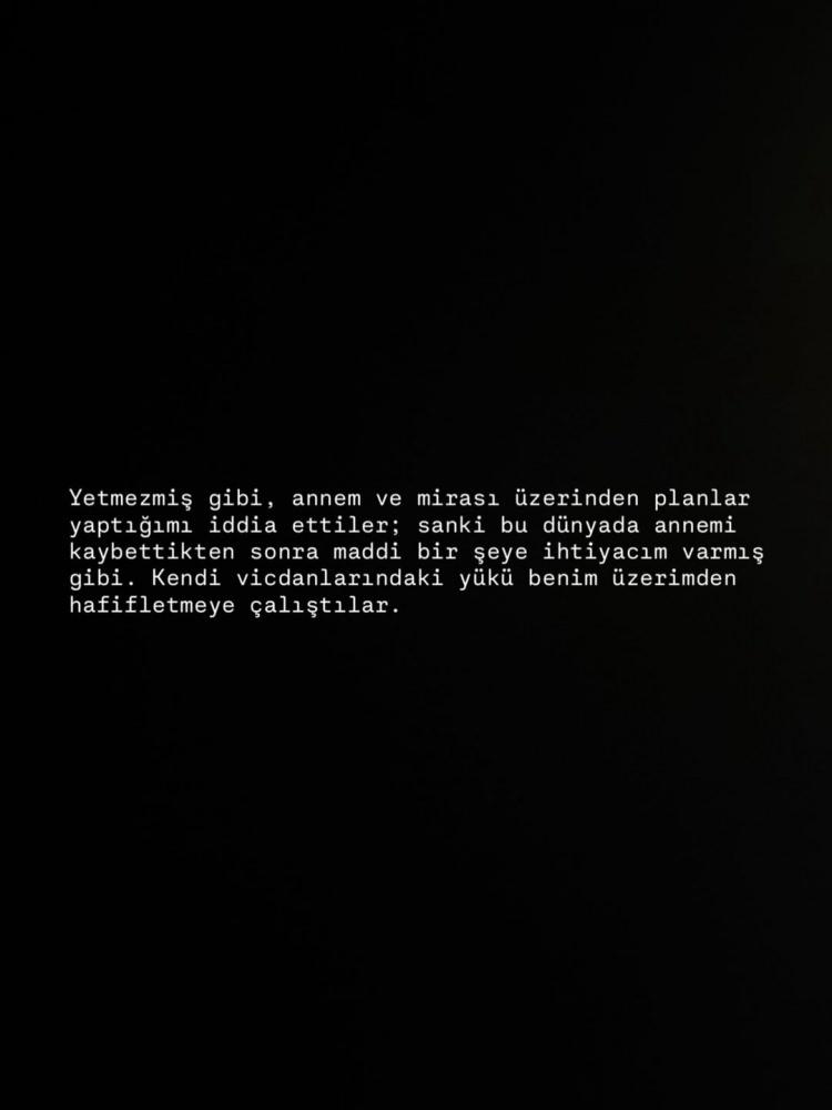 "Yetmezmiş gibi, annem ve mirası üzerinden planlar yaptığımı iddia ettiler; sanki bu dünyada annemi kaybettikten sonra maddi bir şeye ihtiyacım varmış gibi. Kendi vicdanlarındaki yükü benim üzerimden hafifletmeye çalıştılar."