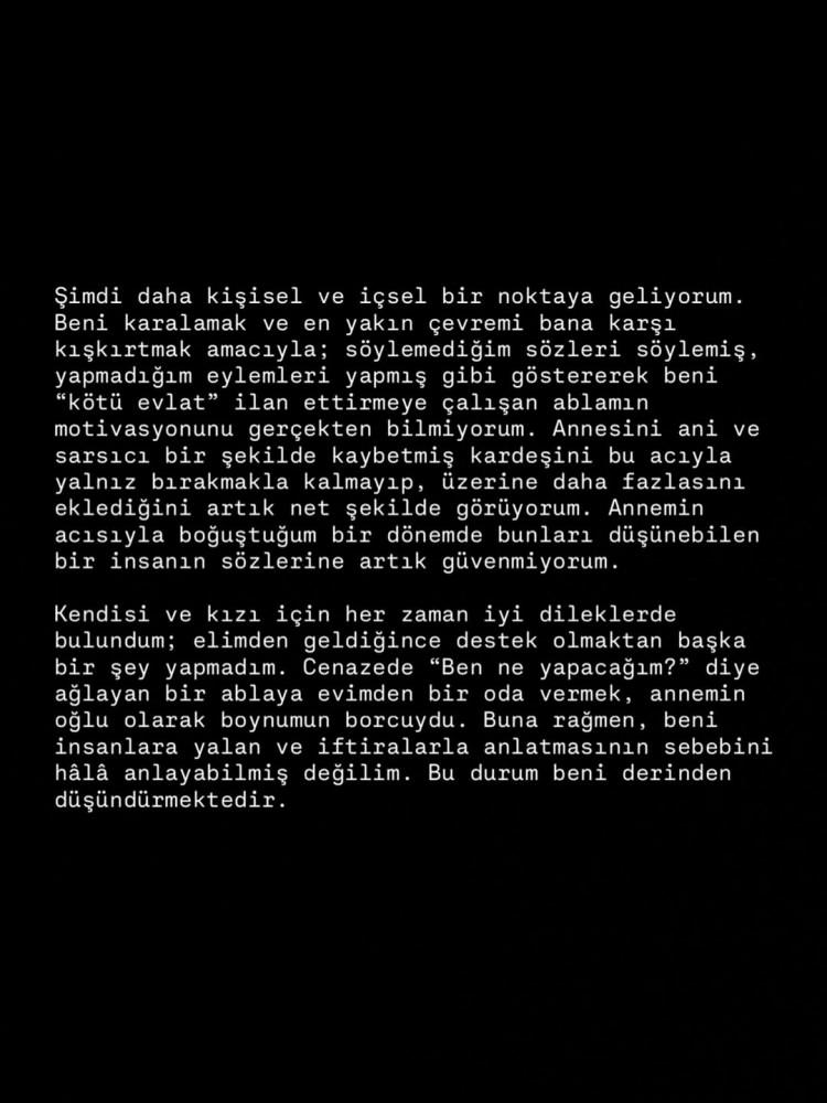 Beni karalamak ve en yakın çevremi bana karşı kışkırtmak amacıyla; söylemediğim sözleri söylemiş, yapmadığım eylemleri yapmış gibi göstererek beni “kötü evlat” ilan ettirmeye çalışan ablamın motivasyonunu gerçekten bilmiyorum. Annesini ani ve sarsıcı bir şekilde kaybetmiş kardeşini bu acıyla yalnız bırakmakla kalmayıp, üzerine daha fazlasını eklediğini artık net şekilde görüyorum. Annemin acısıyla boğuştuğum bir dönemde bunları düşünebilen bir insanın sözlerine artık güvenmiyorum."