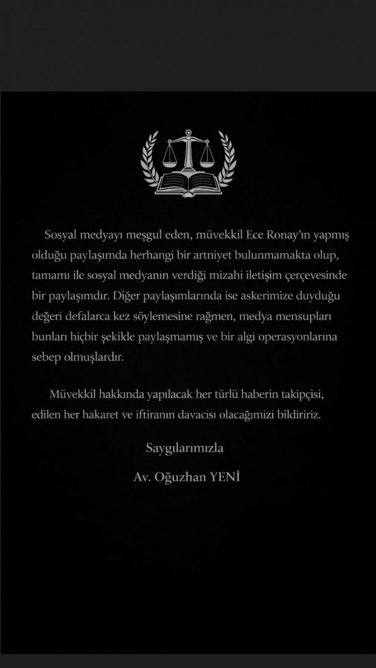Ronay ayrıca avukatlık şirketi tarafından yapılan resmi açıklamayı da kendi hesabında paylaştı.