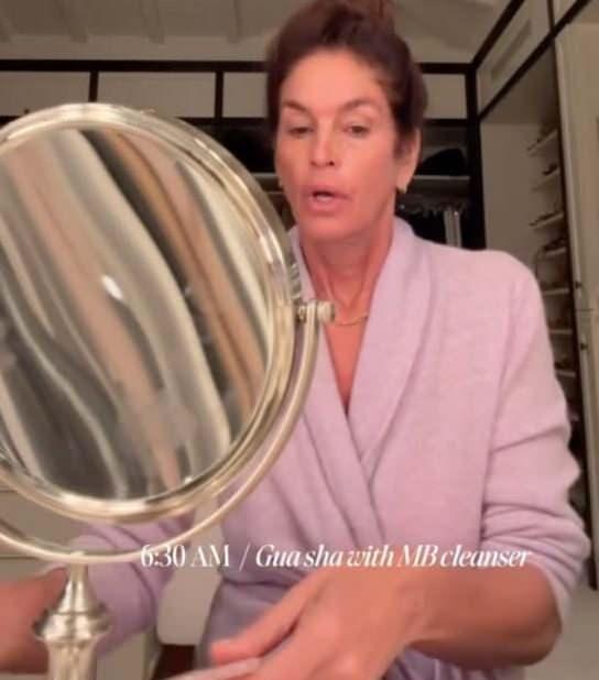 Önce yüzüne bakım uygulayan Crawford, 5 dakika boyunca yüzüne kuru fırçalama yapıyor. Cildine canlılık veren ünlü isim daha sonra yüzüne kırmızı ışık uygulaması yapıyor ve saat 07:00'de bir yudum elma sirkesi içiyor.