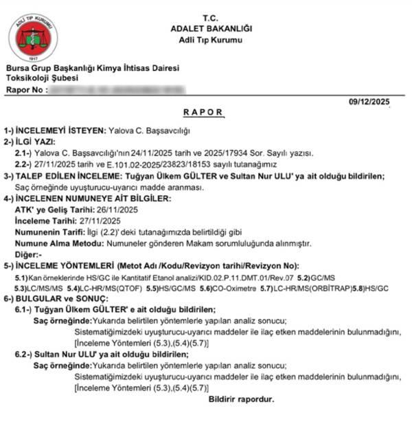 Adli Tıp Kurumu tarafından hazırlanan rapor açıklandı. CNN Türk'ün haberine göre; raporda Gülter ve Ulu'nun vücudunda herhangi bir madde tespitine rastlanılmazken "Yukarıda belirtilen yöntemlerle yapılan analiz sonucu; sistematiğimizdeki uyuşturucu-uyarıcı maddeler ile ilaç etken maddeleri bulunamamıştır" ifadesi yer aldı.