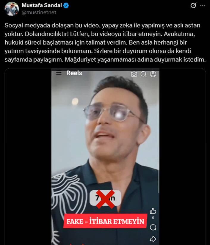 Son yıllarda ünlü isimlerin görüntüleri ve sesleri kullanılarak yapılan 'yapay zeka' destekli dolandırıcılık vakalarına bir yenisi daha eklendi. Ünlü şarkıcı Mustafa Sandal, sosyal medyada yayılan ve yapay zeka ile hazırlandığını belirttiği sahte videosu hakkında sevenlerini uyardı.