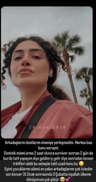 "Herkes bana bunu soruyor. Dominik Miami arası 2 saat olunca Survivor sonrası 2 gün de burada tatil yapayım diye geldim iyi gelir diye. Sonradan konser teklifleri aldık bu sebeple tatil uzadı konu bu. Eşimi, çocuklarımı, ailemi en yakın arkadaşlarımı çok özledim. Son konser 31 Ocak sonrasında 3 Şubat'ta inşallah ülkeme dönüyorum çok şükür''