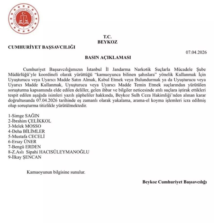 "Cumhuriyet Başsavcılığımızın İstanbul İl Jandarma Narkotik Suçlarla Mücadele Şube Müdürlüğü’yle koordineli olarak yürüttüğü “kamuoyunca bilinen şahıslara” yönelik Kullanmak İçin Uyuşturucu veya Uyarıcı Madde Satın Almak, Kabul Etmek veya Bulundurmak ya da Uyuşturucu veya Uyarıcı Madde Kullanmak, Uyuşturucu veya Uyarıcı Madde Temin Etmek suçlarından yürütülen soruşturma kapsamında elde edilen deliller, gelen ihbar ve bilgiler neticesinde atılı suçlara iştirak ettikleri tespit edilen aşağıda isimleri yazılı şüpheliler hakkında, Beykoz Sulh Ceza Hakimliği’nden alınan karar doğrultusunda 07.04.2026 tarihinde eş zamanlı olarak yakalama, arama-el koyma işlemleri icra edilmiş olup soruşturma titizlikle yürütülmektedir."