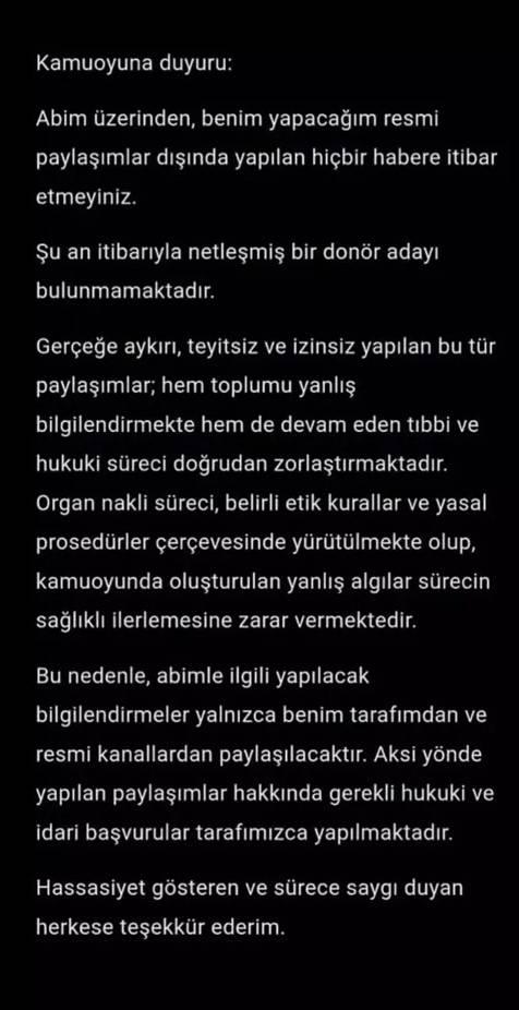 Ağabeyi Ufuk Özkan için netleşmiş bir donör adayı bulunmadığını belirten Özkan açıklamasında, "Ağabeyim üzerinden, benim yapacağım resmi paylaşımlar dışında yapılan hiçbir habere itibar etmeyiniz. Şu an itibarıyla netleşmiş bir donör adayı bulunmamaktadır. Gerçeğe aykırı, teyitsiz ve izinsiz yapılan bu tür paylaşımlar; hem toplumu yanlış bilgilendirmekte hem de devam eden tıbbi ve hukuki süreci doğrudan zorlaştırmaktadır. Organ nakli süreci, belirli etik kurallar ve yasal prosedürler çerçevesinde yürütülmekte olup, kamuoyunda oluşturulan yanlış algılar sürecin sağlıklı ilerlemesine zarar vermektedir. Bu nedenle, ağabeyimle ilgili yapılacak bilgilendirmeler yalnızca benim tarafımdan ve resmi kanallardan paylaşılacaktır. Aksi yönde yapılan paylaşımlar hakkında gerekli hukuki ve idari başvurular tarafımızca yapılmaktadır. Hassasiyet gösteren ve sürece saygı duyan herkese teşekkür ederim" ifadelerini kullandı.