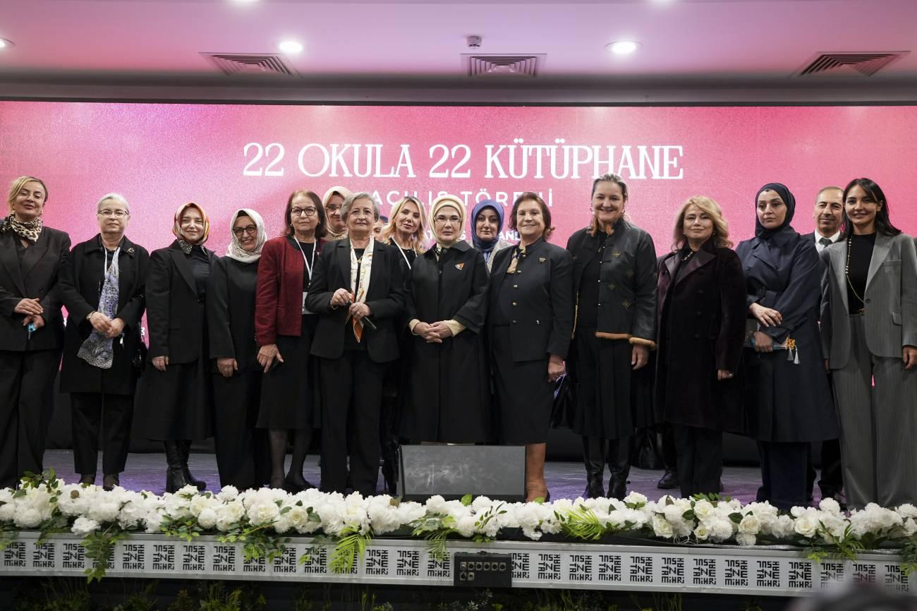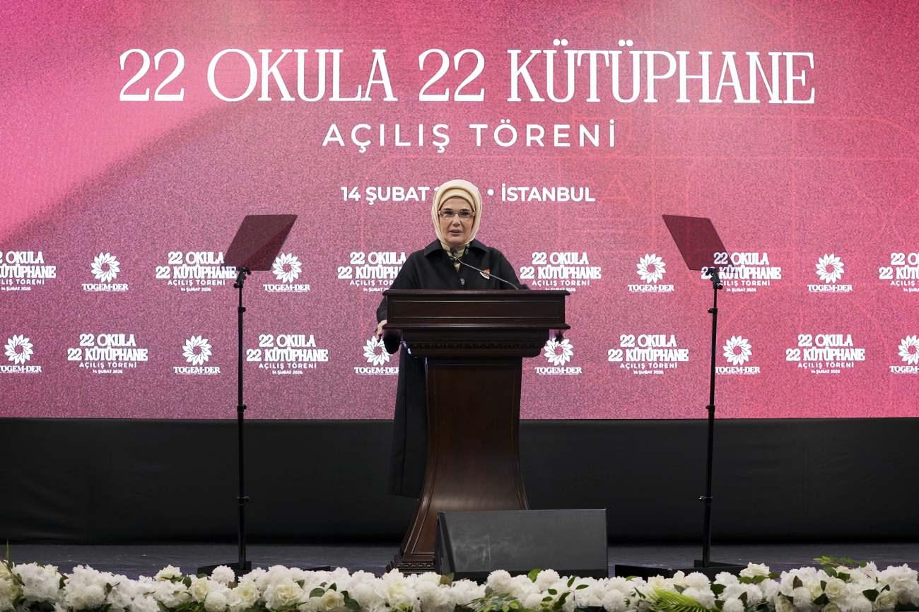 Burada konuşan Emine Erdoğan, 22 okul kütüphanesinin açılışı vesilesiyle katılımcılarla bir arada olmaktan mutluluk duyduğunu dile getirerek, TOGEMDER'i hayırlı bir projeye öncülük ettiği için kutladı.
