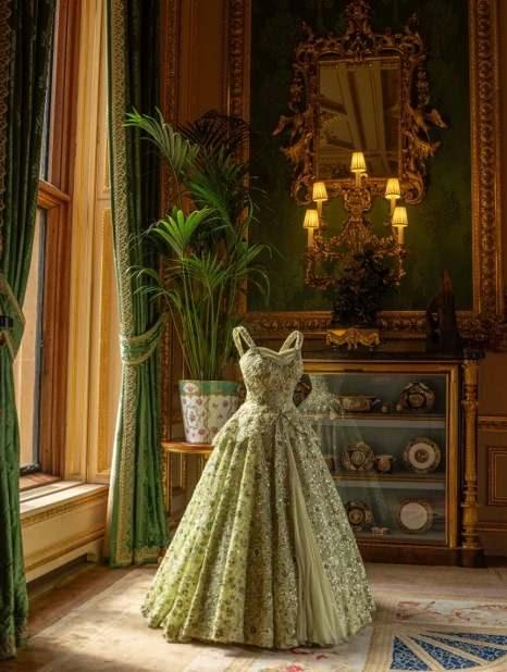 Bir diğer parça ise Norman Hartnell tarafından Kraliçe II. Elizabeth için tasarlanan yeşil parlak elbise. Kraliçe, bu elbiseyi 1957 yılında Washington DC'deki İngiliz Büyükelçiliği'nde Başkan Eisenhower için verilen devlet ziyafetinde giymişti.