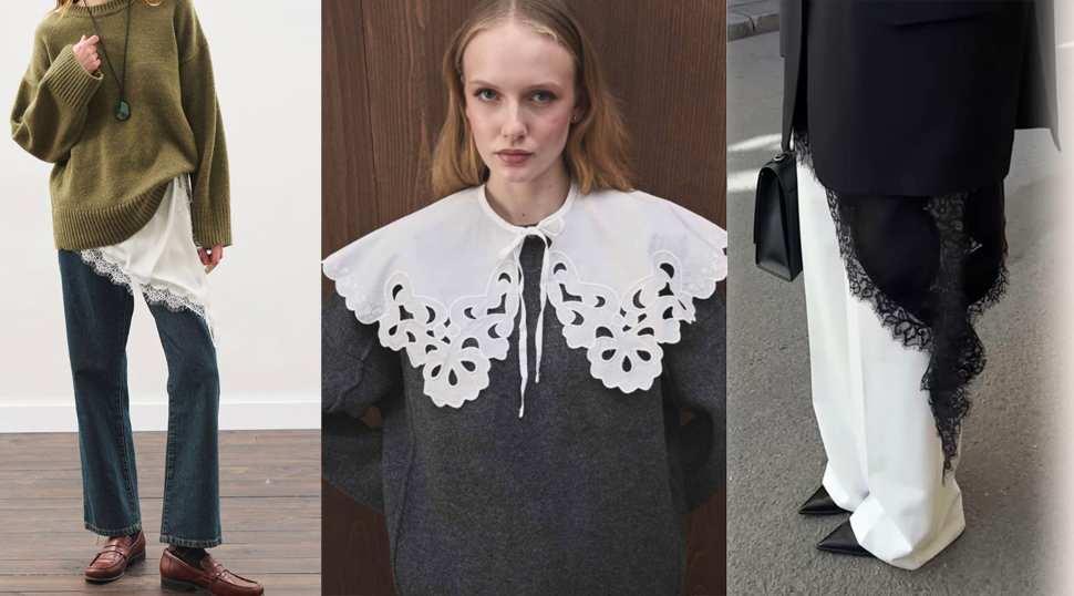 Kazak veya gömlek altında dantel kullanmak görünüme derinlik kazandırıyor. Dönemin yıldızı "devasa işlemeli beyaz dantel yakalar" vintage bir hava yakalamanıza yardımcı olur. Danteli sadece zarif parçalarla değil, büyük vatkalı kabanlar, oversize trikolar ile eşleştirmeyi de deneyebilirsiniz.