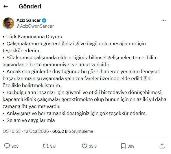 Sancar, sosyal medya platformundan yaptığı açıklamada, çalışmalarına gösterilen ilgi ve övgü dolu mesajlar için teşekkür ederek, kamuoyunda yer alan deneysel başarıların, bu aşamada yalnızca fareler üzerinde elde edildiğini vurguladı.