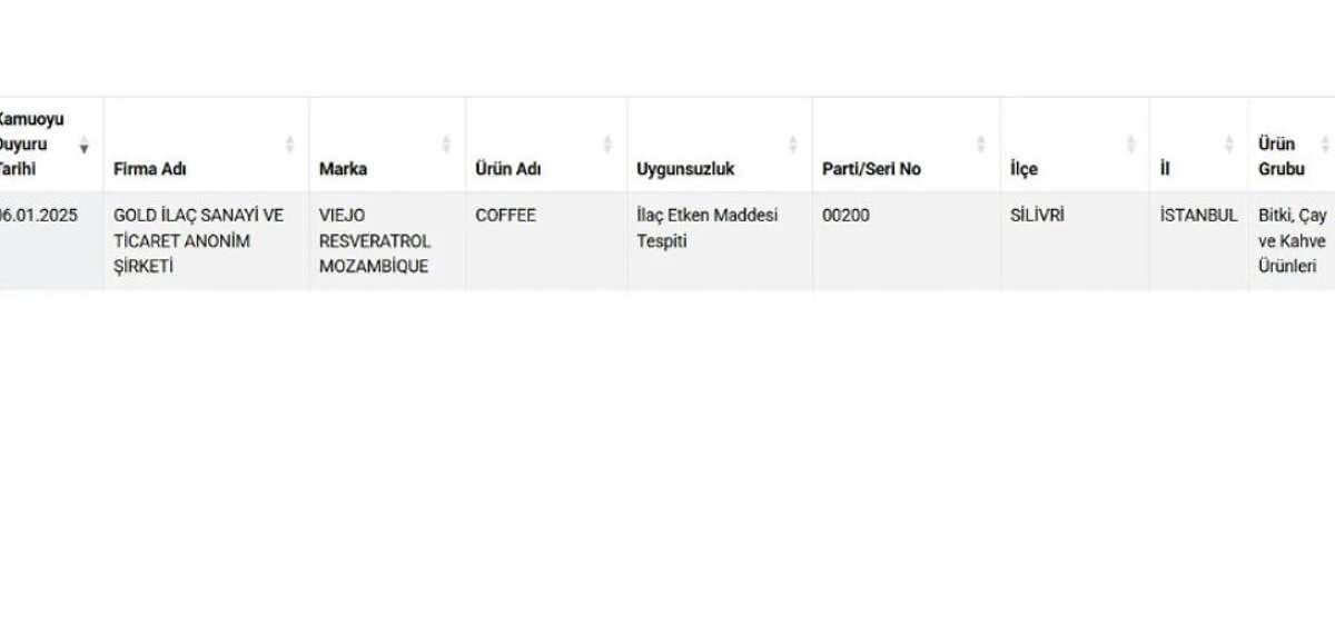 Kahvede "İlaç Etken Maddesi" tespit edildi. istanbul'un Silivri ilçesinde faaliyet yürüten Gold İlaç Sanayi A.Ş. tarafından üretilen kahvede bulunan 'sibutramin', kardiyolojik ve psikiyatrik yan etkileri nedeniyle yasaklanan etken maddeler arasında yer alıyor.